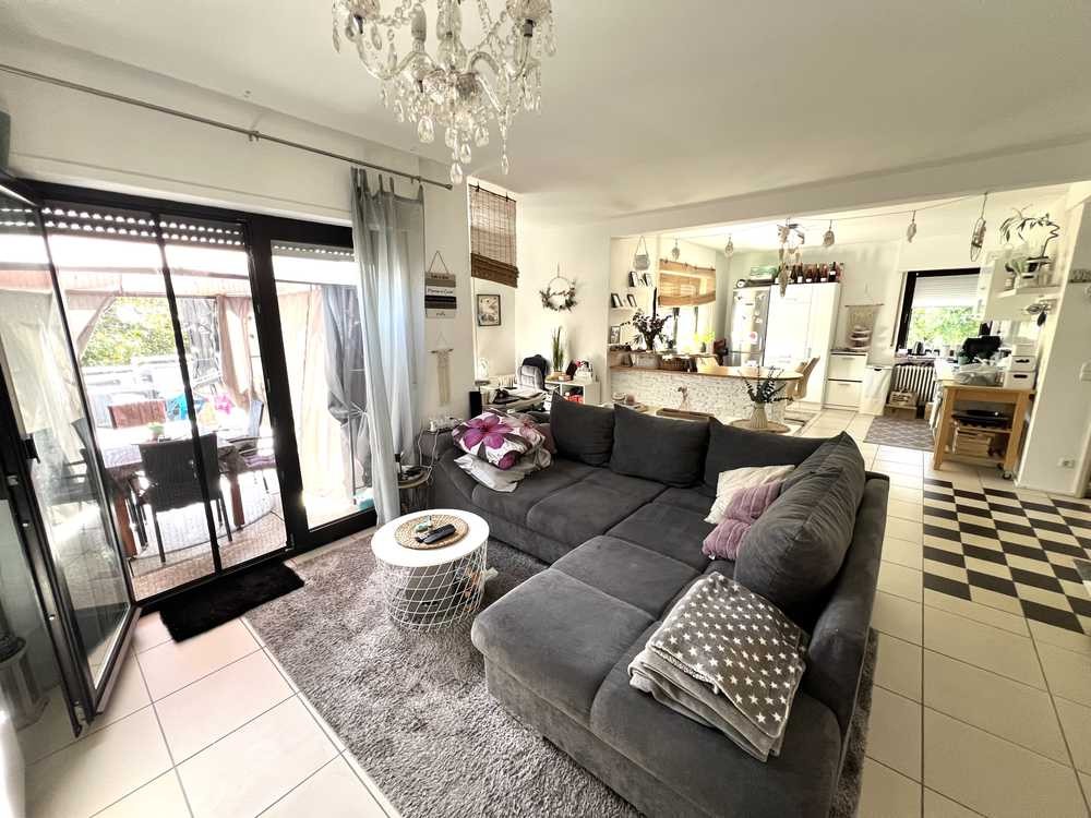 Ein helles Wohnzimmer, das durch seine Größe und den Zugang zur Terrasse besticht, offene Küche, die ausreichend Raum für Koch- und Essbereich bietet.