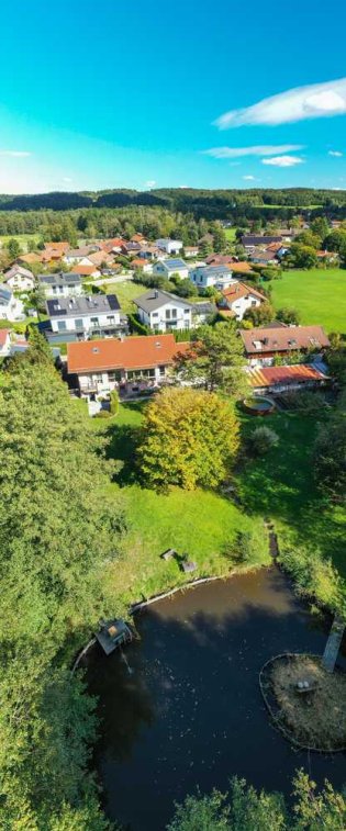 Besonders ist dabei der wunderschöne, großzügige, uneinsehbare Garten mit zwei Terrassen, künstlichen Bachlauf und eigenem Weiher, direkt am Wald hervorzuheben.