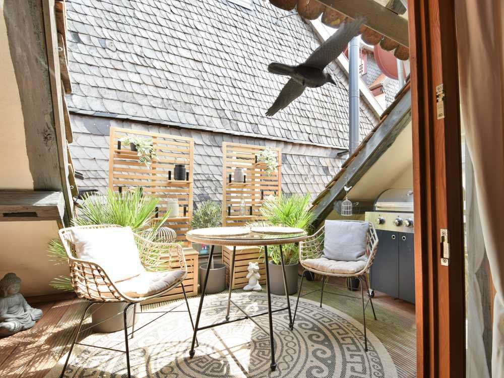 Im Obergeschoss erwarten Sie zwei gemütliche Schlafzimmer mit sichtbaren Balken, ein separater Lesebereich sowie ein modernes, Duschbad. Besonders beeindruckend ist das Wohnzimmer unter dem bis zum Dachfirst reichenden Sichtgebälk – ein Raum voller Atmosphäre, der zum Verweilen einlädt. Von hier aus gelangen Sie auf die charmante Dachterrasse mit gemütlicher Sitzecke – ein privater Ort zum Entspannen inmitten der Altstadt. Ein kleiner Kriechkeller unter der Küche bietet zudem praktischen Stauraum, etwa für eine Weinsammlung.