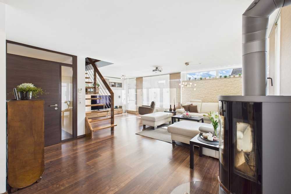Mit über 50 qm Wohnfläche bildet dieser das Herzstück der Immobilie: Bodentiefe Fenster, Dekorwände in Steinoptik, ein großzügiger Balkon mit traumhaftem Blick in den Garten sowie ein freistehender Schwedenofen sorgen für zeitlose Gemütlichkeit. Ein schönes Detail und gutes Beispiel für die besonderen Akzente, die überall in dieser Immobilie zu finden sind, ist das eingelassene Regal für Holzscheite. Im Essbereich ideal platziert, hat es nicht nur Funktion, sondern fügt es sich auch als stilvolles Designelement in den Raum ein.