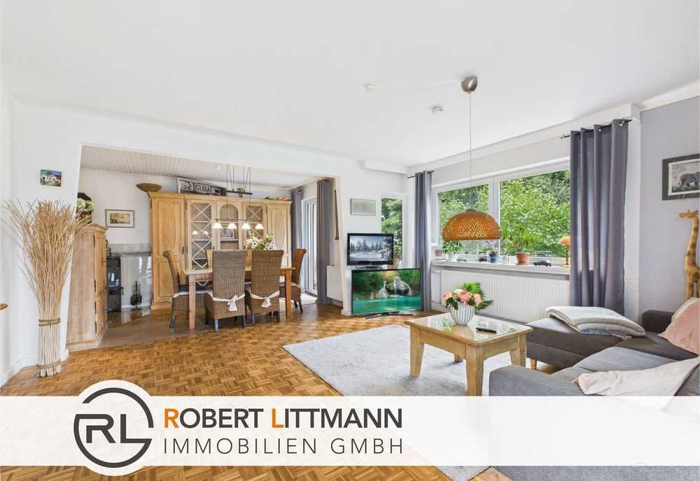Besonders hervorzuheben sind die zahlreichen Fensterfronten mit den Schiebeelementen, die den Zugang zum Balkon und der überdachten Hochterrasse ermöglichen und gleichzeitig den Blick in den Garten öffnen. Der Kamin und der Parkettboden verleihen dem Wohnzimmer eine behagliche Atmosphäre.