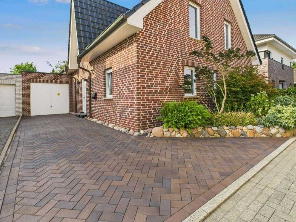 Schon von außen fällt die hochwertige Bauweise ins Auge: ein eleganter roter Klinker mit sandfarbenen Fugen, massive Fensterbänke, Kupferdachrinnen und eine Friesengaube über dem Eingangsbereich. Vor dem Haus erwarten Sie eine stilvolle Pflasterung mit gebranntem Klinkerstein, eine Natursteinmauer mit Zierpflanzen sowie gleich mehrere Stellplätze. Hier ist Platz für die ganze Familie – und auch für Gäste.