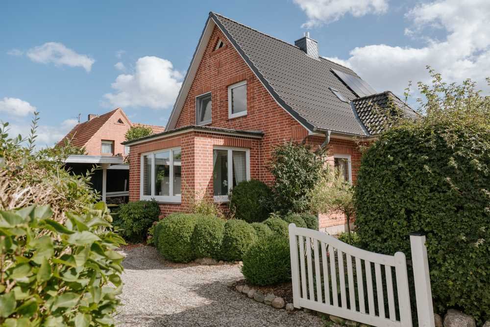 Der Vorgarten ist pflegeleicht angelegt, die umlaufende Hecke bietet das Maximum an Privatsphäre.