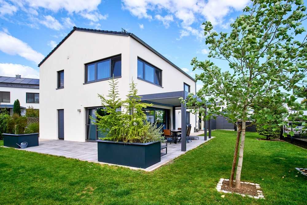 Das attraktive Einfamilienhaus mit Doppelgarage wurde 2014/2015 in Ziegel-Massivbauweise erstellt. Es besticht durch seine moderne Architektur und Ausstattung. Das ebene und rechteckige Grundstück umfasst 735 m². Die ca. 187 m² Wohnfläche verteilen sich auf Erd- und Obergeschoss. Vom überdachten Hauseingang betritt man die Diele im Erdgeschoss. Von dort erreichen Sie einen großzügigen Wohn-/Ess-/Kochbereich (mit Speis), ein Büro sowie Dusche/WC. Vom Essbereich führt eine breite Hebe-Schiebetür auf den überdachten, nach Süden ausgerichteten Teil der Terrasse. Vom Wohnbereich aus betreten Sie die nach Westen ausgerichtete Terrasse. An den Außenseiten der Terrassenüberdachung schützen vier Textilscreens vor Wind- und Sonneneinfall. Von der Diele aus führt eine Stahlwangentreppe (mit Echtholz-Eichenstufen und Edellstahlhandlauf) ins offen ausgebaute Obergeschoss, in dem Sie ein Schlafzimmer mit Ankleide, drei Zimmer und das großzügige Bad vorfinden. Beim Tageslicht-Bad, das mit bodentiefer Dusche und Badewanne ausgestattet ist, sind der installierte Hydro-Lüfter sowie eine Wandheizung in der Dusche hervorzuheben. Von den nach Osten ausgerichteten Zimmern im Obergeschoss ist das Flachdach der Garage betretbar - nach geringfügigen Umbaumaßnahmen wäre die Nutzung als Dachterrasse möglich. Das Objekt ist sehr gut gebaut bzw. ausgestattet.