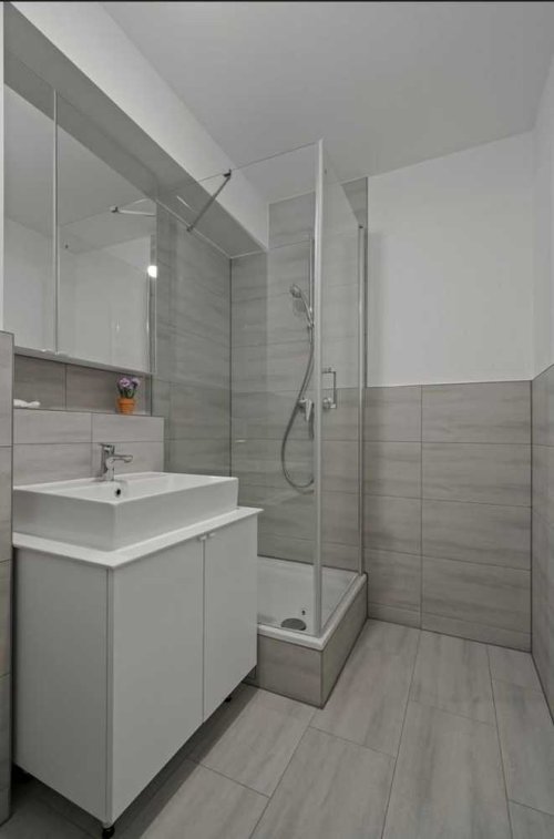 Das innenliegende modern renovierte Duschbad ist funktional mit Badmöbel gestaltet und verfügt über einen Waschmaschinenanschluss.