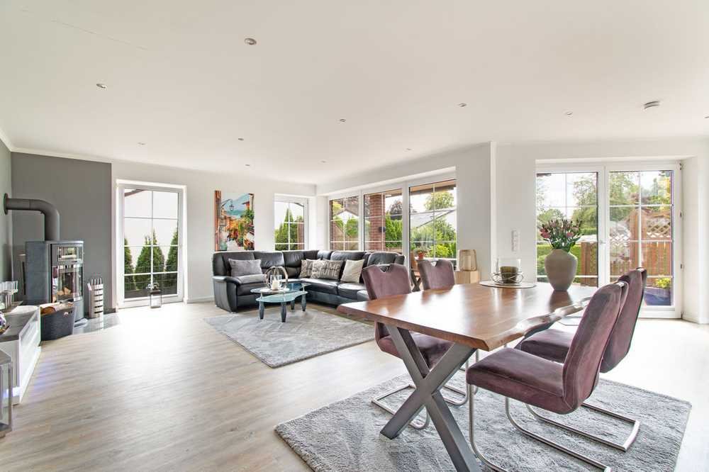 - Lichtdurchfluteter, offener Wohnbereich mit behaglichem Kaminofen als Herzstück der Immobilie