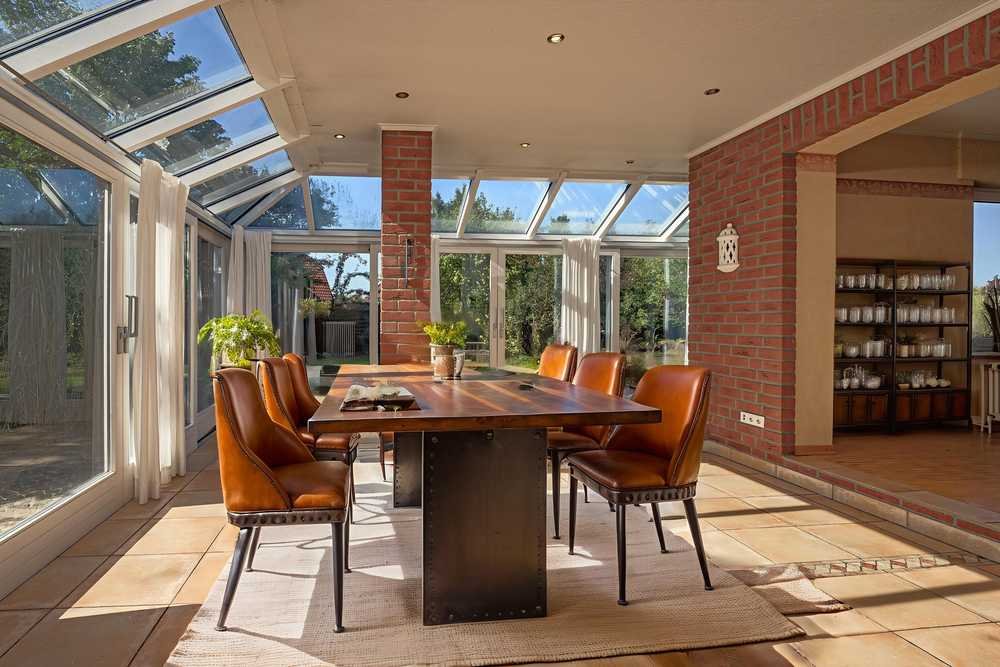 Der große Wintergarten mit Kachelofen, 1999 neu errichtet, ist sowohl von der Essdiele als auch vom Wohnzimmer aus direkt zugänglich – ein lichtdurchfluteter Lieblingsplatz für jede Jahreszeit.