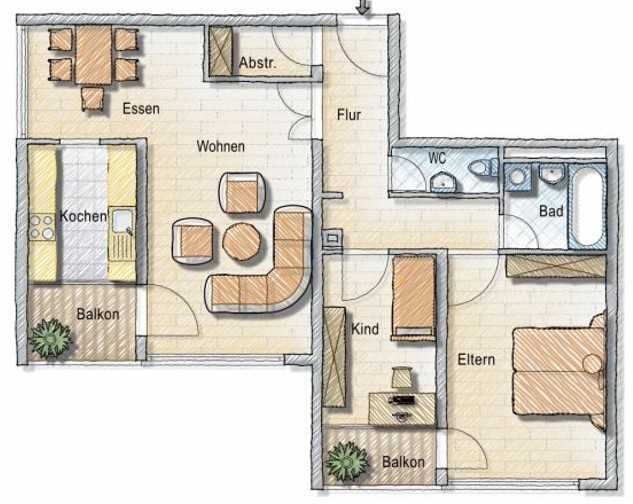 Die Wohnung verfügt über ca. 84 m² Wohnfläche mit einen großen offenen Wohn- und Essbereich, Schlaf- und Kinderzimmer, Bad, WC, Küche, einem Abstellraum in der Wohnung, zwei Balkone.