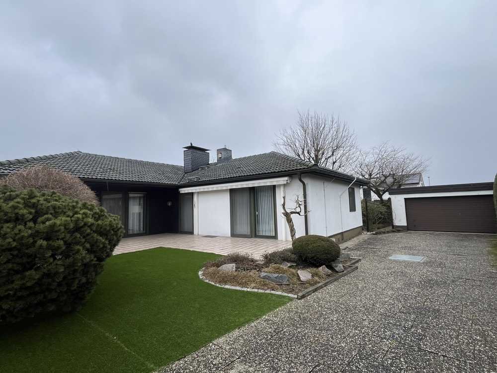 Freistehender Winkel-Bungalow 1-Familien-“Fertighaus“ extrem, ruhige Lage, großes Grundstück , schön angelegte Rasen- und Gartenflächen, 2 große Terrassen (1 mit Überdachung inkl. Glaskuppel bzw. 1 mit Markise),voll unterkellert, Untergeschoss mit Sauna, Dusche/WC, Whirlpool, Kaminecke, Bibliothek, Büro, sowie Waschraum, Vorratsraum, Werkraum und Heizraum, kleiner Anbau massiv (u.a. für Gartengeräte) Verlängerung des Anbaues als überdachter Freisitz / Grillplatz, Doppelgarage + davor weitere Stellplätze.