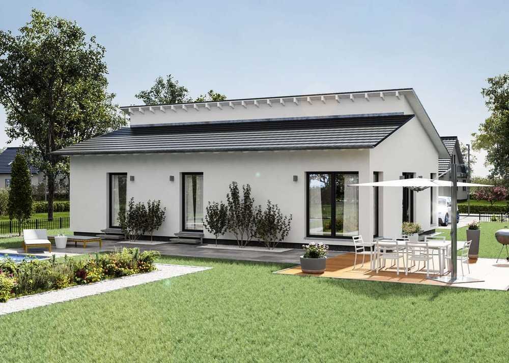 Der attraktive Bungalow ComfortStyle 10.02 P mit Pultdach bietet ideenreichen Baufamilien auf 108 m² viele Möglichkeiten, die eigenen Vorstellungen umzusetzen. Ein echtes Highlight ist die überdachte Terrasse mit direktem Zugang aus dem großzügigen Wohn-, Ess- und Küchenbereich. An schönen Tagen lässt sich so der Wohnraum ins Freie hinaus verlängern. Daneben erhöhen das geräumige Bad und viele intelligent integrierte Stellflächen oder Stauräume den individuellen Wohnkomfort. Nicht zuletzt überzeugt das ComfortStyle 10.02 P mit einer klaren, geradlinigen Architektursprache.
