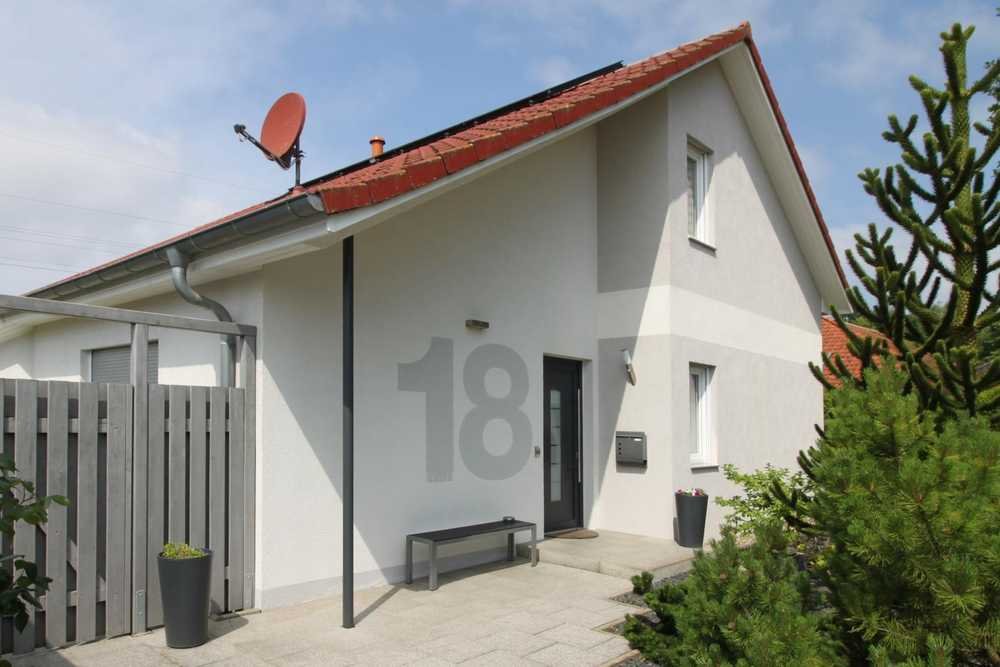Mit ausmittigem First, Schleppdachbereich und (teilweise) zum Dach offenen Wohnbereich sowie einer große, nach Süden ausgerichteten, Fensterfront hebt sich das Haus angenehm von Standard-Häusern ab. Von den 187 Quadratmetern Wohnfläche befinden sich 112 m² im Erdgeschoss (Wohn- und Essbereich, Küche, Schlafzimmer, Kinderzimmer, Flur, Bad und Gäste-WC) und 33 m² im Obergeschoss (Gästezimmer mit Balkon und Flur). Weitere 33 m² (z.Zt. als Abstellraum genutzt) können im Obergeschoss noch ausgebaut werden (Fußbodenheizungsvorbereitung). Zu den Nutzflächen zählen eine Doppelgarage (36 qm), mit automatischen Garagentoröffnern und Wallbox sowie ein Schuppen (ca. 6 m²) für Gartengeräte und die Swimmingpooltechnik. Ein kleiner Swimmingpool und ein Wasserbecken mit Springbrunnen sorgen im Sommer für Urlaubsfeeling im uneinsehbaren Garten. Im Winter kann man bei Sonnenschein im großen Wintergarten frühstücken, da die Terrasse nach Süden ausgerichtet ist. Eine 8,50 m breite, bodentiefe Fensterfront sorgt im offenen Wohnbereich des Erdgeschosses dafür, dass der Sitz- und Essbereich sowie Küche und Flur angenehm lichtdurchflutet sind. Im Hochsommer sorgen elektrische Rollläden und eine Fußbodenkühlung(!) für ein gleichbleibend angenehmes Raumklima. Vom Balkon im Obergeschoss genießt man den Blick über Wiesen und Felder.