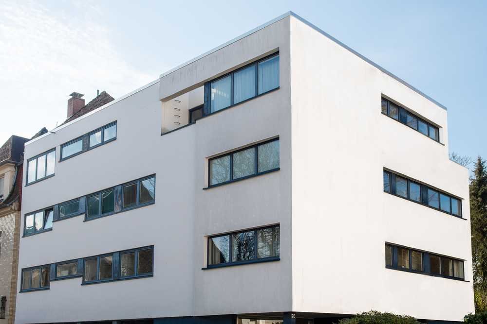 Das Wohngebäude besticht durch sein zeitloses Bauhausdesign, welches Kunst und Handwerk harmonisch miteinander verbindet