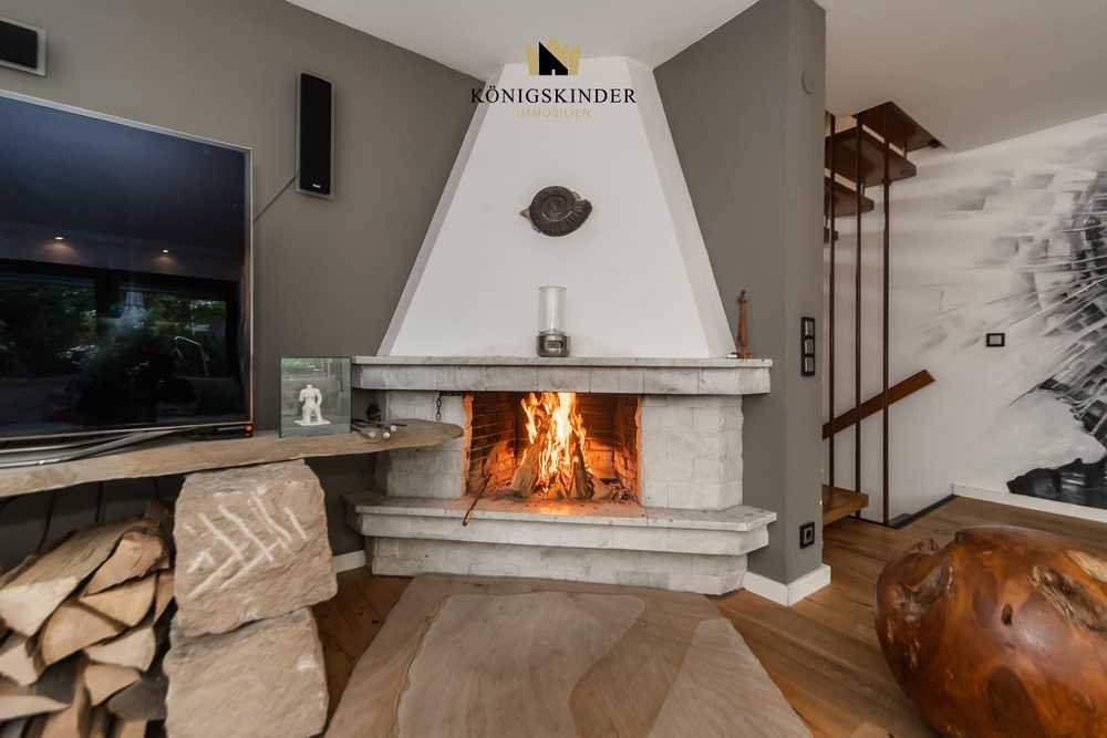 Das Herzstück des Hauses bildet sicherlich der große und offen gestaltete Wohn- und Essbereich mit offenem Kamin im Erdgeschoß, mit direktem Zugang zur großen Terrasse und in den Garten. Des Weiteren befinden sich die Küche und das Gäste-WC auf dieser Etage.