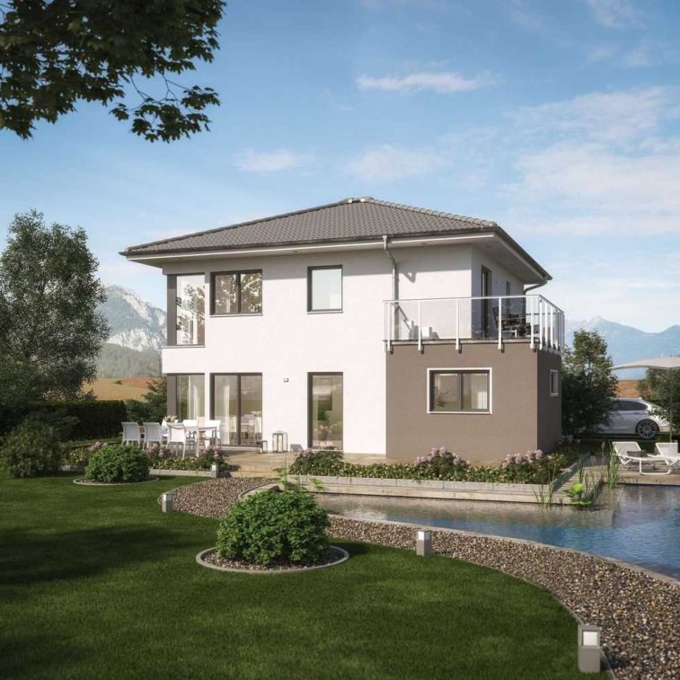 Waren Stadtvillen früher nur dem Adel und dem gehobenen Bürgertum vorbehalten, sind sie heute ein beliebter Haustyp für Familien. Das liegt nicht zuletzt an ihrem riesigen Platzangebot im Innern: Auf zwei Vollgeschossen finden alle großen und kleinen Bewohner genügend Entfaltungsfreiraum. Aber auch ihr repräsentatives Äußere überzeugt viele Bauwillige. Ein Beispiel für eine familientaugliche Stadtvilla ist dieses Fertighaus. Der schlichte, würfelförmige Basisbaukörper wird erweitert von einem Carport, der sich über Eck in eine praktische Terrassenüberdachung verlängert. Den oberen Abschluss des Gebäudes bildet ein klassisches Walmdach. Über eine elegante Design-Haustür gelangt man ins Innere der Villa, das perfekt auf das Leben einer fünfköpfigen Familie ausgerichtet ist. Die Diele wurde mit fast 9 m² sehr großzügig bemessen. Hier können sich auch mehrere Personen aufhalten, ohne dass es zu eng wird - ein nicht zu unterschätzender Vorteil, gerade wenn morgens alle Bewohner gleichzeitig das Haus verlassen. Jacken, Schuhe und Mäntel verschwinden in der geräumigen Garderobe, an die sich das Gäste-WC und der Technik- bzw. Hauswirtschaftsraum anschließen. Rechts neben dem Eingang liegt ein helles Büro, das Ruhe bei der Arbeit verspricht. Im hinteren Teil des Hauses sind die Gemeinschaftsräume untergebracht - ein lockeres Ensemble aus Wohnzimmer, Essbereich und Küche. Letztere besitzt einen eigenen Zugang zur Diele, sodass die Wochenendeinkäufe nicht erst durch das ganze Haus getragen werden müssen. Raumhohe Verglasungen fluten die offene Wohnlandschaft mit Tageslicht und lassen die Grenzen zwischen innen und außen verschwimmen. Eine elegante, geradläufige Treppe, unter der sich ein kompakter Abstellraum befindet, führt hinauf zu den Ruhe- und Rückzugsbereichen. Der Elterntrakt besteht aus einem luftigen Schlafzimmer, einer Ankleide mit Fenster und einem gemütlichen Wellnessbad. Für den Nachwuchs stehen drei schöne Kinderzimmer und ein eigenes Kinderbad mit Dusche bereit - die perfekte Lösung, um die morgendliche Rushhour zu entzerren.