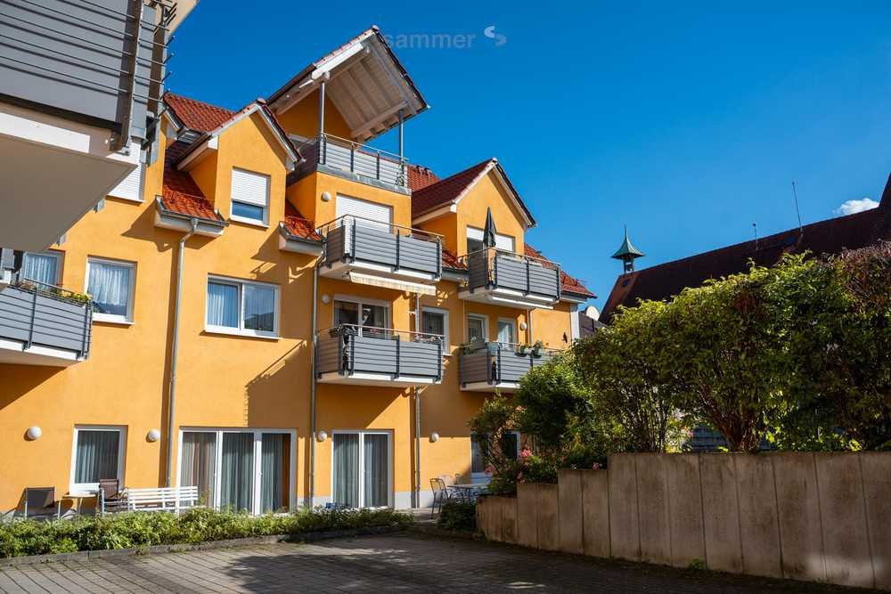Die nach Westen ausgerichtete helle 2-Zimmer Wohnung befindet sich im Dachgeschoss der Wohnanlage und hat einen zum Innenhof gerichteten großzügigen überdachten Balkon und bietet einen Blick auf die Türme der Münster Mariä Himmelfahrt Kirche. Das barrierefreie gehaltene Badezimmer ist mit einer Dusche, WC und Waschbecken ausgestattet.