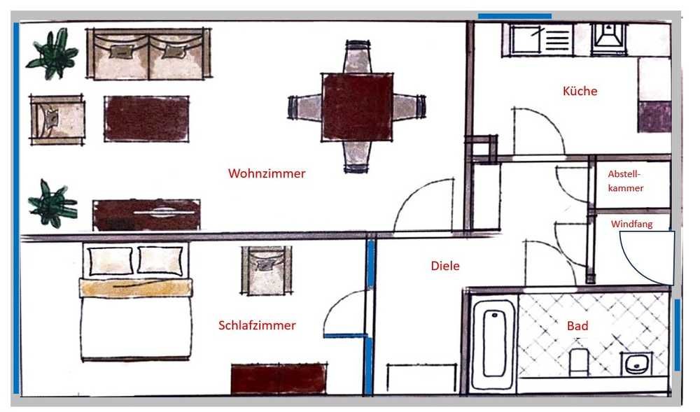 Ein Windfang, eine Diele und ein kleiner Abstellraum ergänzen die Wohnfläche. Der eigene Kellerraum mit Fenster im Untergeschoss bietet zusätzlichen Stauraum. Ein Aufzug, der ein halbes Geschoss über oder unter der Wohnung hält, erleichtert den Zugang zur Wohnung.