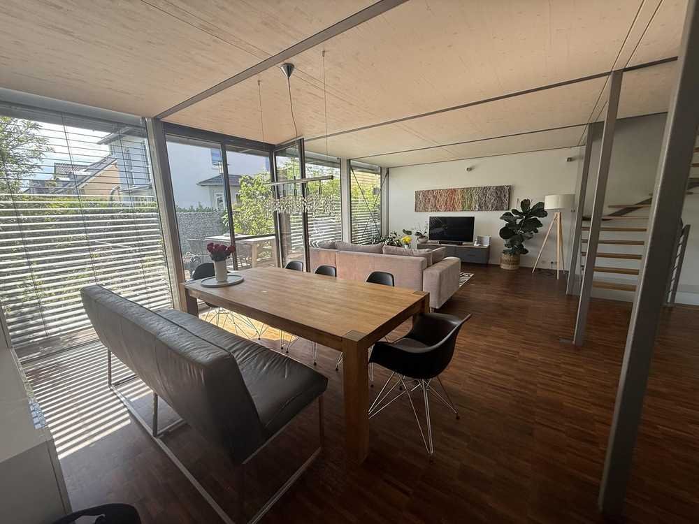 Das in Stahl-/Glas-/Holzkonstruktion gebaute Architektenhaus besticht durch seinen lichtdurchfluteten offenen Baustil im Bauhausstil.