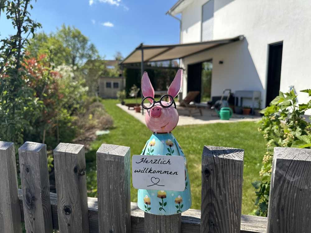 Das moderne Einfamilienhaus besticht durch seine neuwertige Architektur und energieeffiziente Bauweise, die den Niedrigenergie-Standard erfüllt. Es befindet sich in einer malerisch-ländlichen Umgebung, in mitten von grünen Feldern und Bäumen, die eine ruhige und entspannte Atmosphäre schaffen.