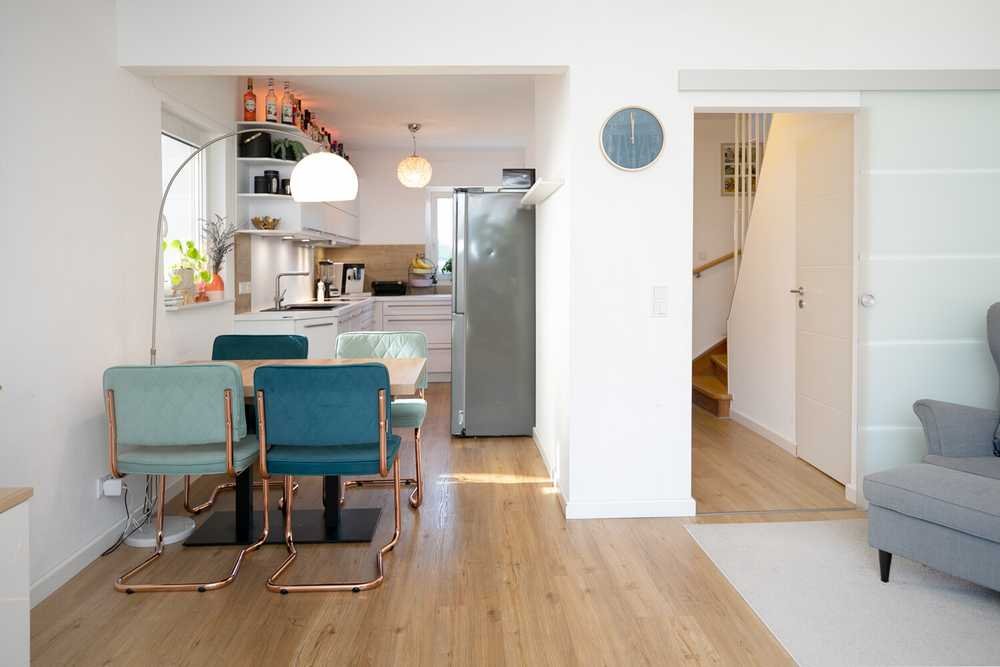 Im Erdgeschoss empfängt Sie eine offene, moderne Wohnküche, die in einen lichtdurchfluteten Wohn- und Essbereich übergeht. Von hier aus gelangen Sie direkt auf die großzügige Sonnenterrasse und in den liebevoll angelegten Garten mit perfekter Südausrichtung. Der Garten bietet nicht nur Platz für Erholung und gesellige Stunden, sondern auch einen separaten Spielbereich für Kinder und ist somit ein echtes Paradies für die ganze Familie.