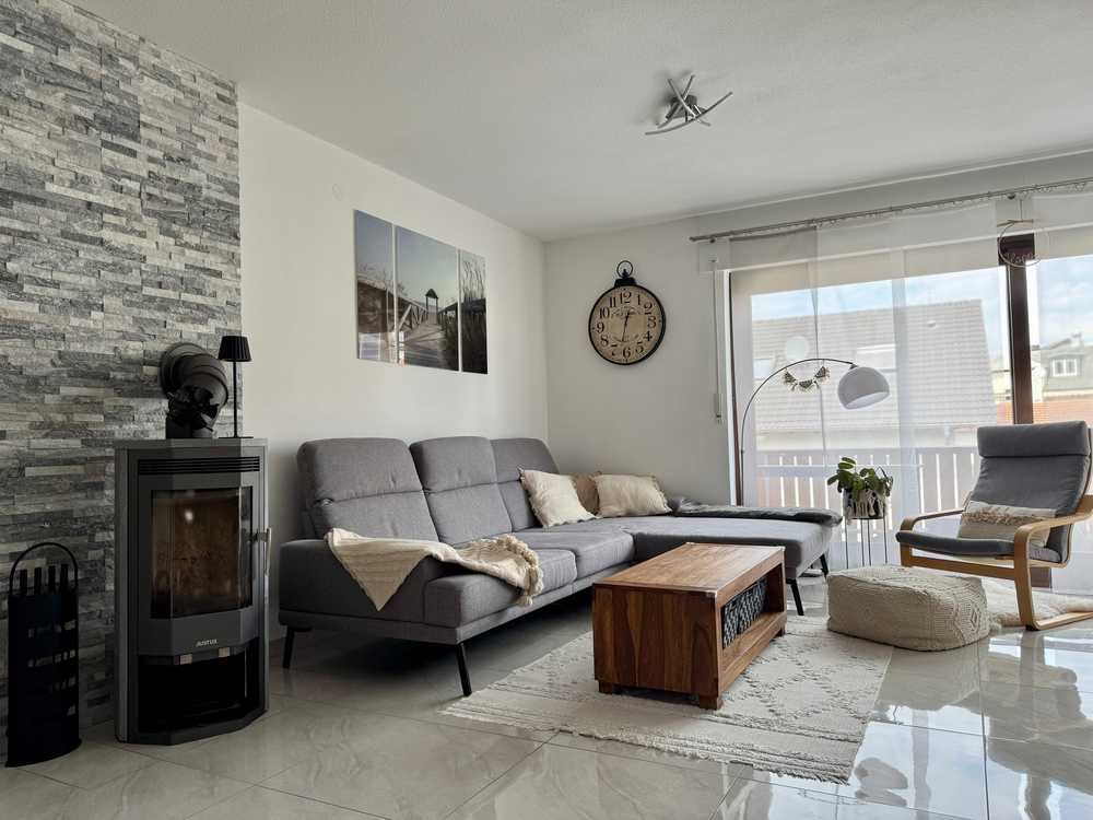 Die Maisonette erstreckt sich über zwei Ebenen und vermittelt mit ihrem separaten Eingang ein hohes Maß an Privatsphäre im Stil einer Doppelhaushälfte. Das großzügige Wohnzimmer ist das Herzstück der Wohnung – lichtdurchflutet, offen gestaltet und mit einem gemütlichen Kaminofen ausgestattet, der besonders in der kühleren Jahreszeit für eine behagliche Atmosphäre sorgt. Die Balkone laden zum Verweilen ein – ob zum Frühstück in der Morgensonne oder zum entspannten Ausklang des Tages.