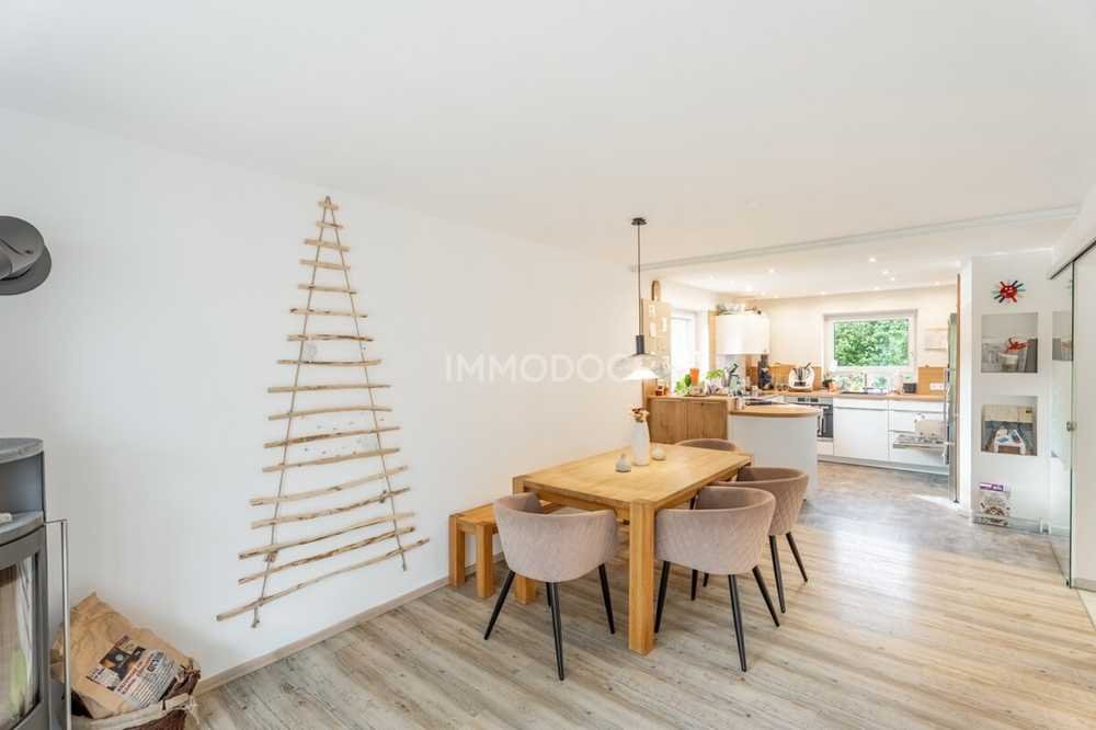 Diese großzügige Doppelhaushälfte in Waltenhofen-Rauns überzeugt durch modernes Wohnen, hochwertige Ausstattung und eine ruhige Lage in einer Privatstraße ohne Durchgangsverkehr. Im Erdgeschoss empfängt Sie eine helle Diele mit Gäste-WC, die in den offenen Wohn- und Essbereich mit moderner Küche übergeht. Der Kamin im Wohnzimmer sorgt an kühleren Tagen für eine besonders gemütliche Atmosphäre, und vom Wohnbereich aus gelangen Sie direkt auf die vordere Terrasse.