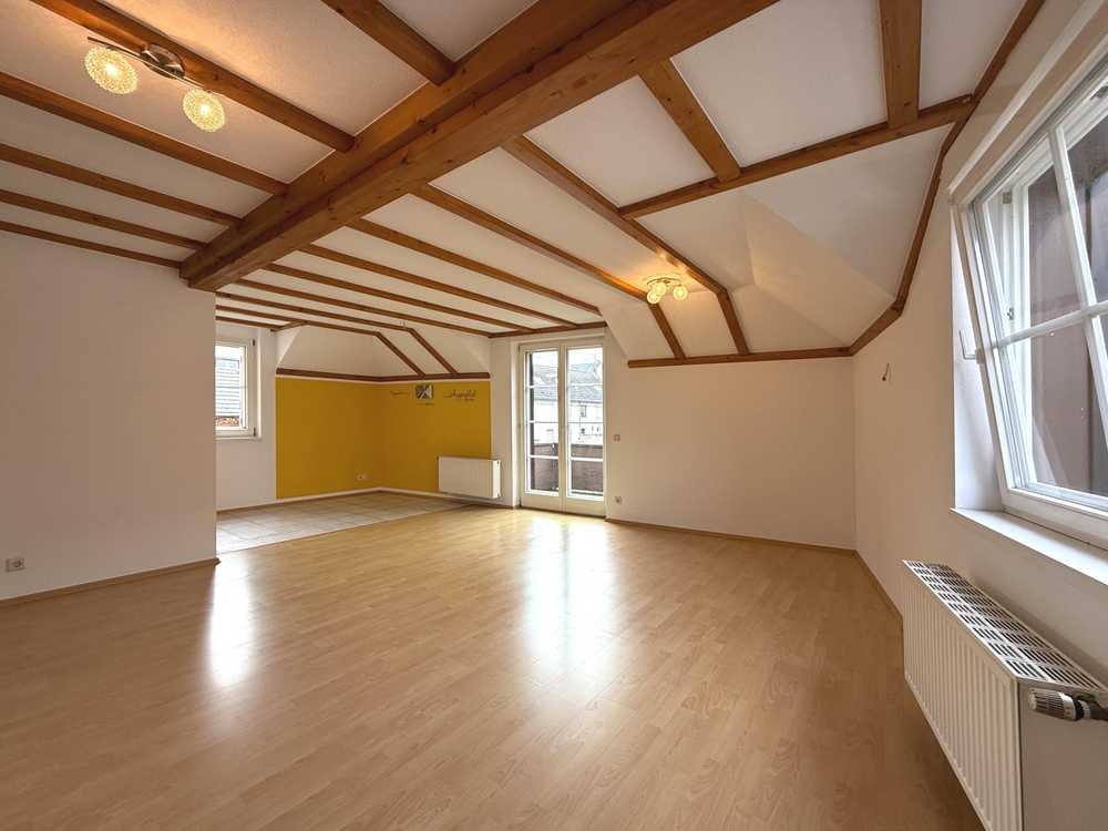 Die Wohnung verfügt über insgesamt drei Zimmer mit einem einheitlichen Laminatboden, der die Räume harmonisch miteinander verbindet. Besonders eindrucksvoll sind die sichtbaren Holzbalken an der Decke, die dem Zuhause einen einzigartigen Charakter verleihen.