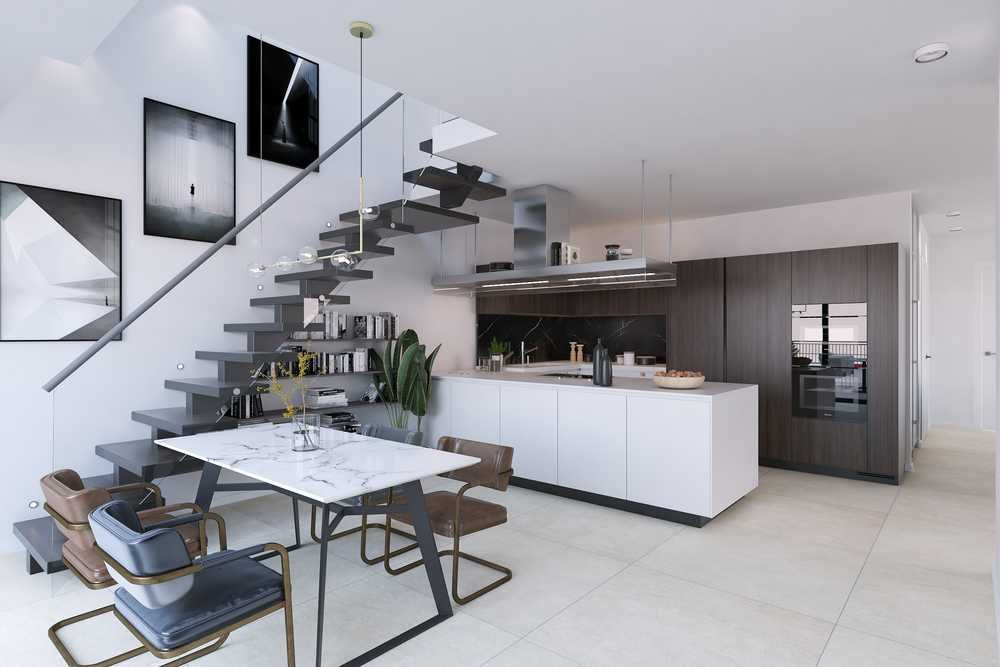Der Mittelpunkt des Lebens ist der großzügige, offene Wohnbereich mit direktem Zugang zur Dachterrasse – perfekt, um den Tag entspannt ausklingen zu lassen. Die angrenzende Küche fügt sich harmonisch in das Raumkonzept ein und schafft eine offene, einladende Atmosphäre.