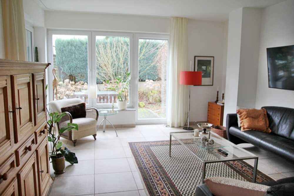 Wohnzimmer mit Essplatz, Küche mit Einbauküche, Gäste-WC, Hauswirtschaftsraum und Terrasse.