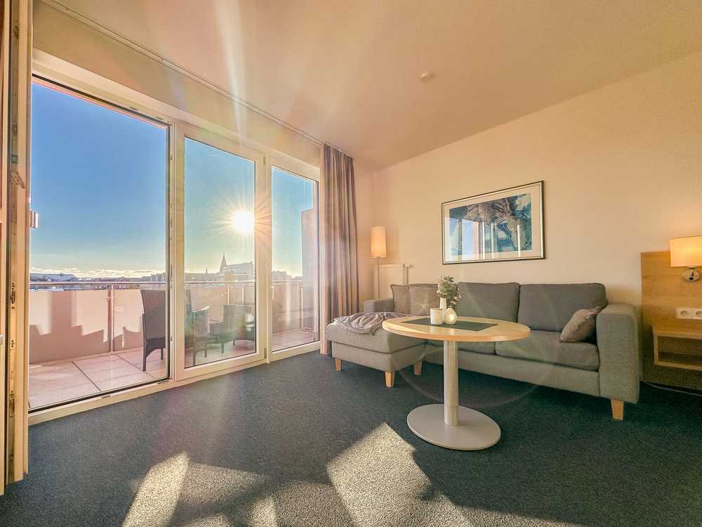 Der lichtdurchflutete Wohn- und Schlafbereich ist nach Süden ausgerichtet und bietet Platz für ein komfortables, freistehendes Doppelbett, eine gemütliche Sofaecke mit Récamiere, einen Essbereich für zwei Personen sowie einen großen Kleiderschrank.
