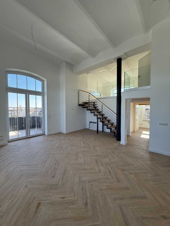 Der großzügige Wohnbereich mit Zugang zum Balkon öffnet sich galeriartig nach oben. Die elegante Galerieebene bietet vielfältige Nutzungsmöglichkeiten – ideal als Rückzugsort, Arbeitsbereich oder kreativer Raum. Der edle Fischgrätboden, das gläserne Geländer und die stilvollen Holzelemente schaffen eine harmonische Verbindung zwischen historischem Charakter und moderner Ästhetik.