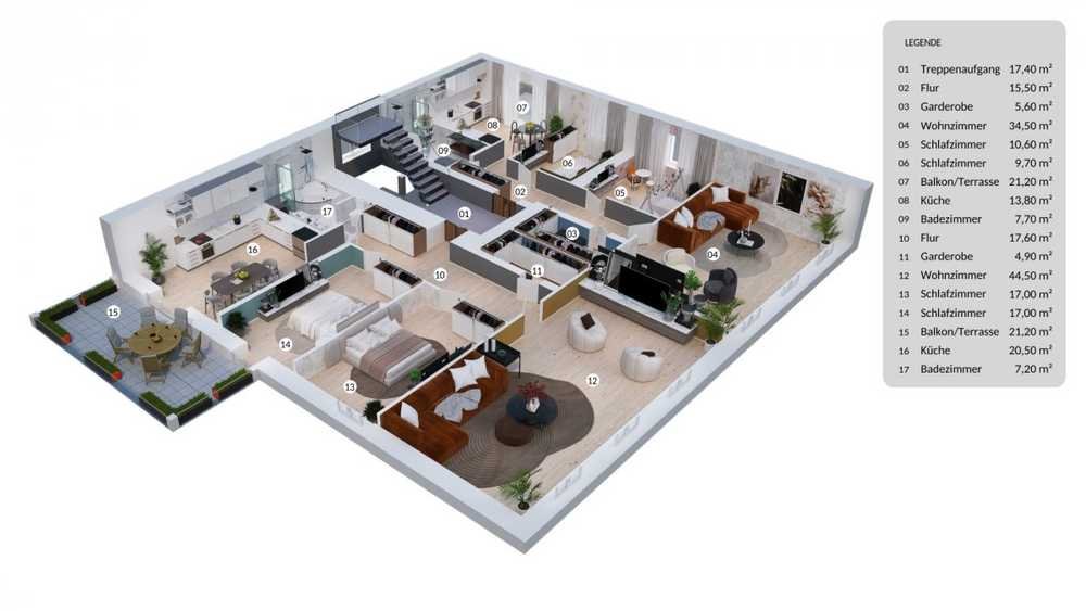 Ein weiteres Highlight: Jede Wohnung verfügt über einen großzügigen Außenbereich. Genießen Sie entspannte Stunden auf Ihrem 21 m² großen Balkon oder auf einer beeindruckenden 60 m² Terrasse, die mit einem luxuriösen Jacuzzi ausgestattet ist.
