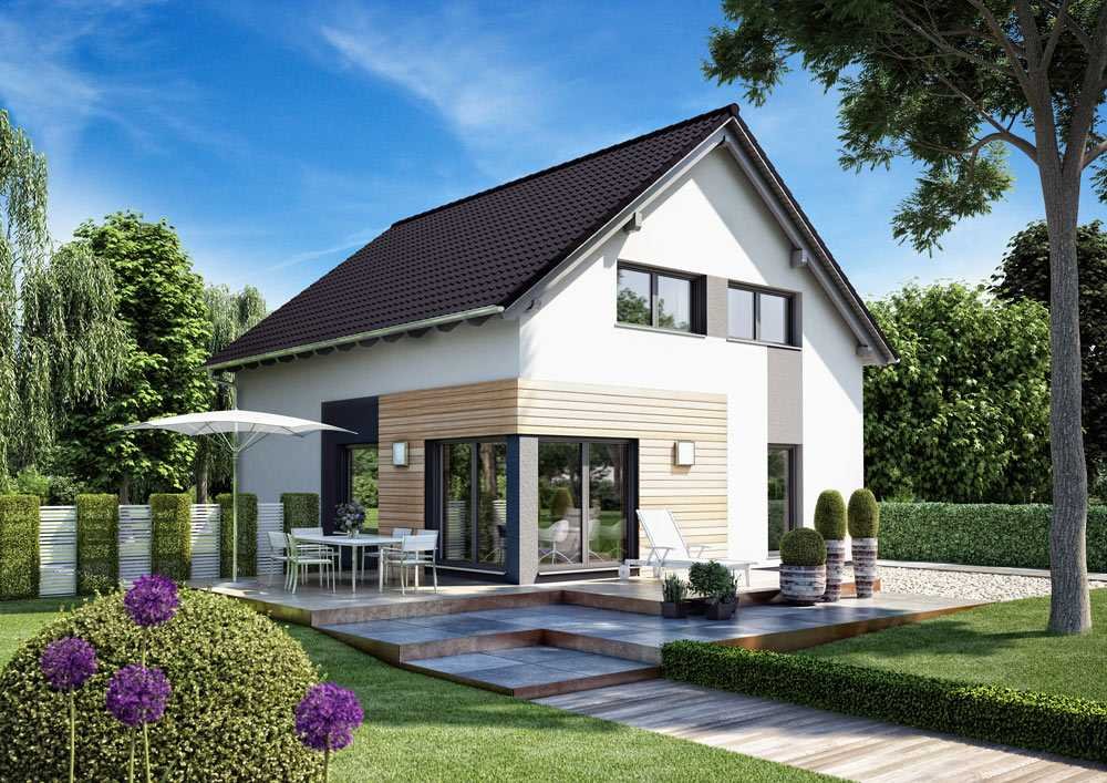 Die Architektur besticht durch klare Linien und einen markanten Rechteck-Erker, der durch einen dritten Giebel besonders hervorgehoben wird. Diese außergewöhnliche Gestaltung sorgt für eine optische Gliederung des Wohn- und Essbereichs und lässt dank großer Fensterflächen viel Tageslicht ins Hausinnere strömen.