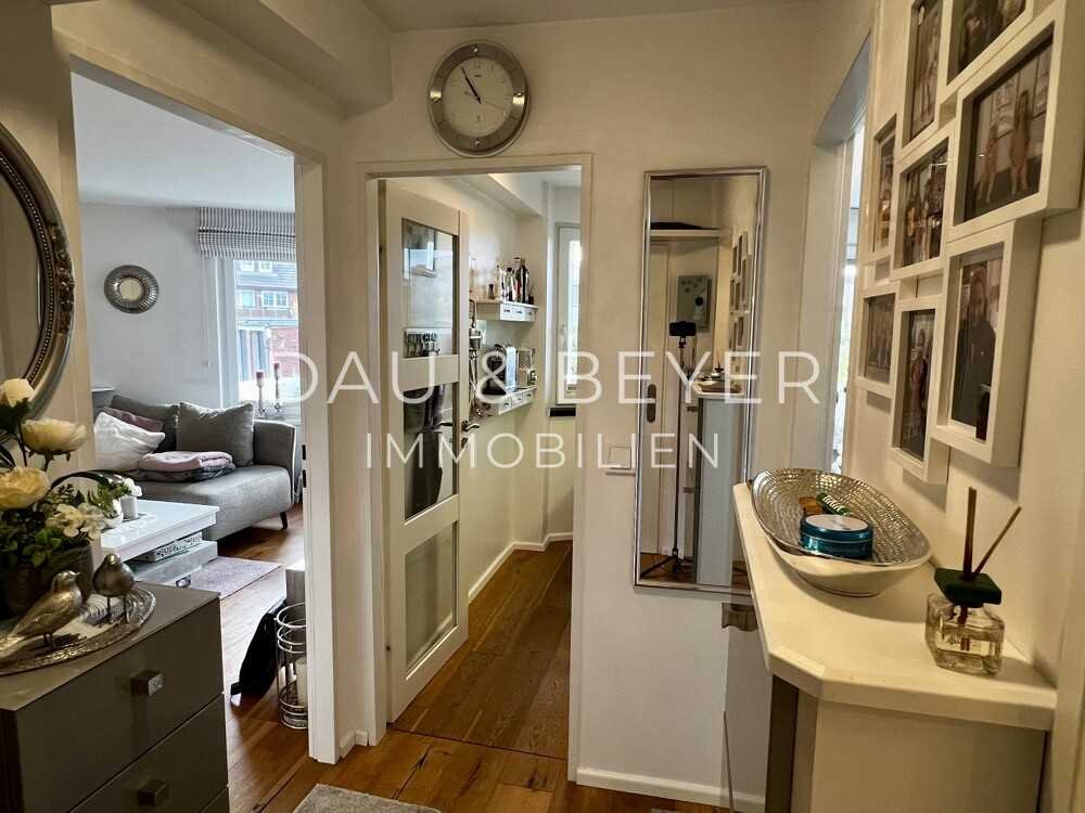 Die Wohnung verfügt über ein modernes Badezimmer mit Fußbodenheizung und großer Dusche. Schlafzimmer mit Teppichboden, maßgefertigten Einbauten und Balkonzugang. Die voll ausgestattete Einbauküche öffnet sich zum Wohn- und Essbereich mit Eichenholzparkett, großem Fensterfront, elektrischem Kamin und Einbauschränken.