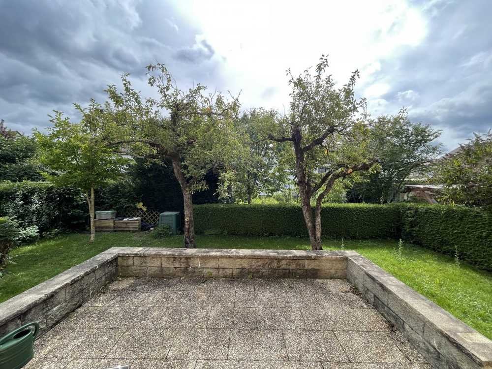 Von diesem schönen und hellen Wohnzimmer geht man auf die Terrasse, diese liegt leicht erhöht und eröffnet den Blick über den wirklich süßen Garten mit einem Apfelbaum, der im Frühjahr herrlich blüht. Der Garten hat genau die richtige Größe, um einen Garten zu fühlen, für Kinder genügend Spielmöglichkeiten und auch genügend Platz um im Sommer die Wäsche draußen zu trocknen. Ein schönes Gartenfest, läßt sich ebenfalls toll vorstellen, es ist ein wenig märchenhaft hier.