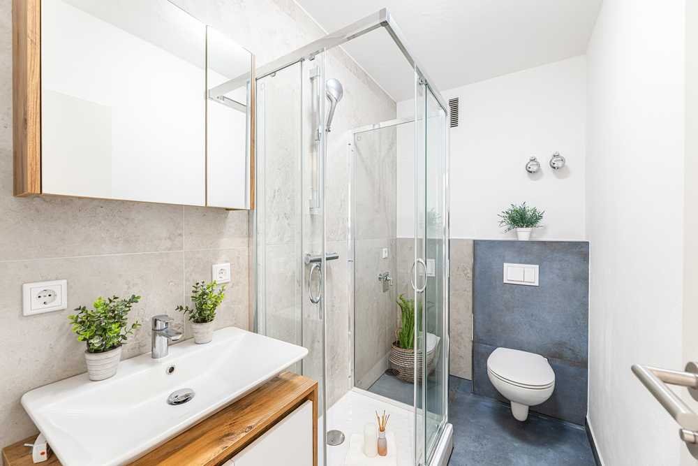 -Neu gefliestes Bad mit Dusche, WC und Waschmaschinenanschluss.