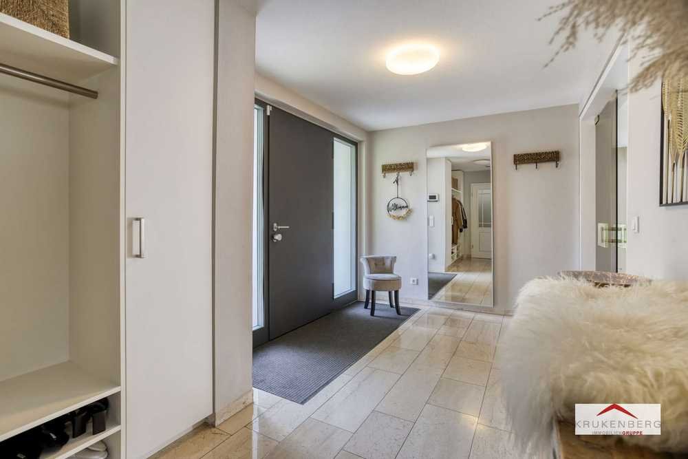 Bereits beim Betreten des Hauses beeindruckt der großzügige Eingangsbereich, der ebenerdig zur Straße liegt. Hier befinden sich ein elegantes Gäste-WC sowie der praktische Zugang zum Innenhof und zur massiven Doppelgarage. Der angrenzende Wohnbereich bietet durch große Fensterflächen einen freien Blick in den grünen Garten und lädt mit seiner stilvollen Atmosphäre zum Verweilen ein.