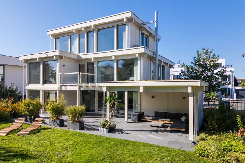The fittings meet the highest standards of design and quality: exclusive brand manufacturers characterize the luxurious bathrooms. Elegant real wood parquet flooring underlines the exclusive character. Modern underfloor heating with a heat pump, controlled by individual room thermostats, guarantees comfort and energy efficiency. Triple thermal insulation glazing ensures a perfect indoor climate and security. In addition, the ground floor, upper floor, and penthouse floor are equipped with high-quality air conditioning, which ensures pleasantly cool temperatures on hot days.