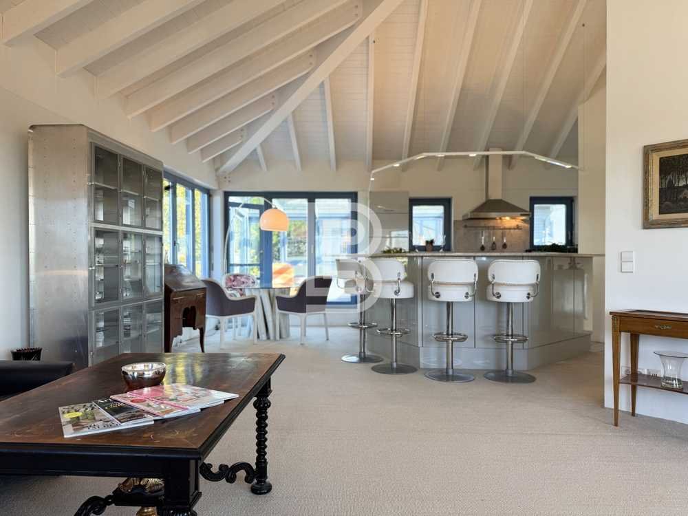 Schon beim Betreten entfaltet sich eine besondere Atmosphäre. Über eine Treppe, die elegant ums Eck führt, gelangt man in den offenen Wohnbereich, der durch hohe Decken mit sichtbaren Balken und große Fensterflächen geprägt ist. Viel Tageslicht und großzügige Raumwirkung schaffen ein Ambiente voller Leichtigkeit und Wohlgefühl.