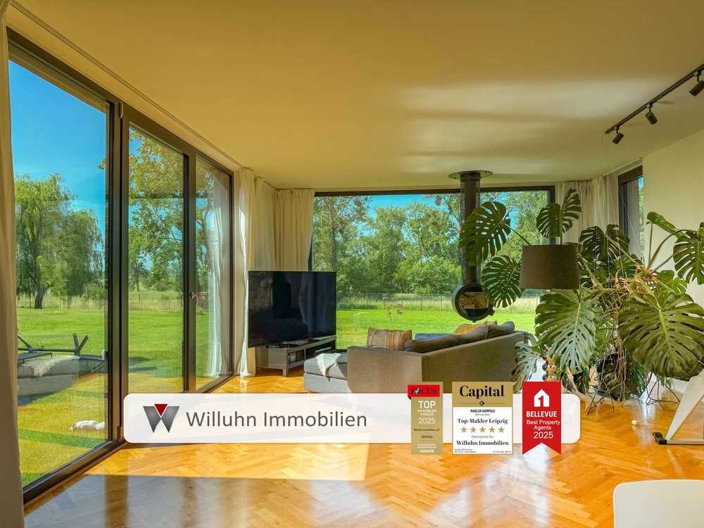 Der offen gestaltete Wohn- und Essbereich – mit einem eleganten, von der Decke hängenden Kamin als Blickfang – öffnet sich zur Gartenlandschaft hin und vermittelt ein einmaliges Raumgefühl von Weite, Ruhe und Naturverbundenheit.