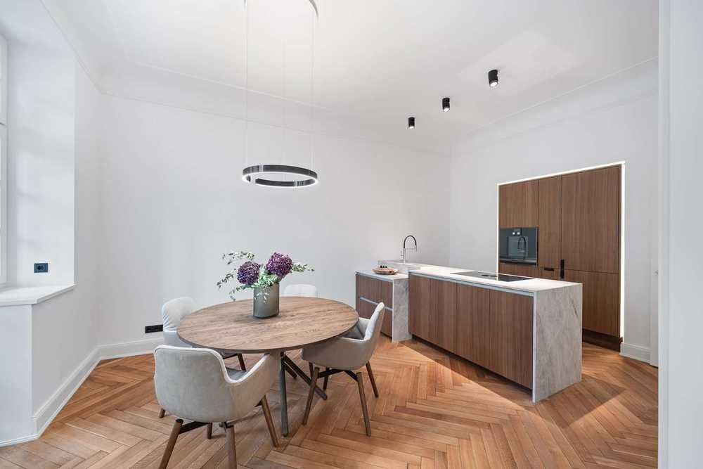 Diese exquisite Wohnung besticht durch ihre großzügige Raumaufteilung, lichtdurchflutete Zimmer und hohe Decken, verziert mit Stuck, die sofort ein Gefühl von Eleganz und Großzügigkeit vermitteln. Mit zwei Schlafzimmern und einem zusätzlichen Gästezimmer bietet sie ausreichend Platz für Familie, Gäste oder ein stilvolles Homeoffice. Zwei hochwertige Bäder, eins mit edler Badewanne und bodengleicher Dusche sowie ein Duschbad, ergänzt durch ein separates Gäste-WC, garantieren höchsten Komfort. Zwei Balkone, hofseitig neu gestaltet und straßenseitig stilvoll saniert, laden zum Verweilen im Freien ein Die Auswahl von elegantem Fischgrät- und klassischem Dielenparkett verleiht den Räumen eine besondere Wärme. Besonders hochwertige Ausstattungen wie Designer-Armaturen von Gessi, maßgefertigte Waschtische und Handtuchwärmer unterstreichen den exklusiven Charakter der Bäder. Die offene Wohnküche mit Naturstein-Arbeitsplatte und Premiumgeräten von Gaggenau, Miele, Bora und Neff wird zum Mittelpunkt des stilvollen Wohnens. Modernste Technik, inklusive Smart-Home-Vorbereitung, neuer Elektroinstallation, LED-Lichtkonzepten und Gira E2 Schaltern in Schwarz matt, sorgt für ein Höchstmaß an Komfort und zeitgemäßer Wohnqualität.