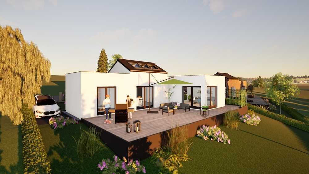 Auf diesem Grundstück entsteht Raum für einen schlüsselfertigen Bungalow mit Anbau der Options-Baureihe von WeberHaus. Puristische Architektur, klare Linien und eine Ästhetik, die Wohnträume neu definiert.