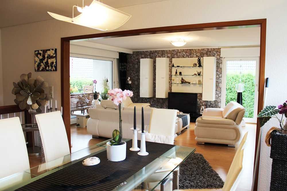 Auf der gegenüberliegenden Seite im Wohnzimmer lädt die überdachte Terrasse zu gemütlichen Sommerabenden ein. Wenige Stufen führen Sie hier in den großzügigen und pflegeleichten Garten, der rundum eingezäunt ist.