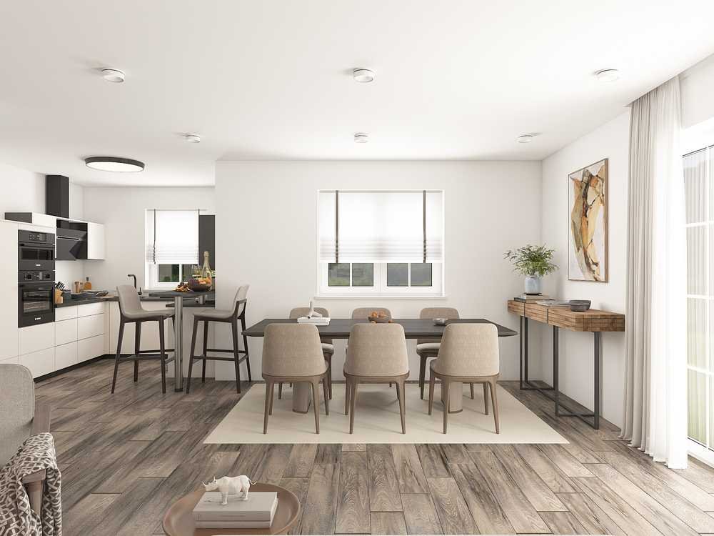 Die Wohnung besticht durch ihren großzügigen Grundriss mit einem offenen Wohn und Essbereich von rund 37 Quadratmetern, der fließend in die angrenzende Terrasse übergeht. Große Fensterfronten sorgen für ein helles, freundliches Ambiente und öffnen den Blick ins Grüne. Die offen gestaltete Küche ist harmonisch in den Wohnbereich integriert und bietet ausreichend Platz für geselliges Kochen und Beisammensein.