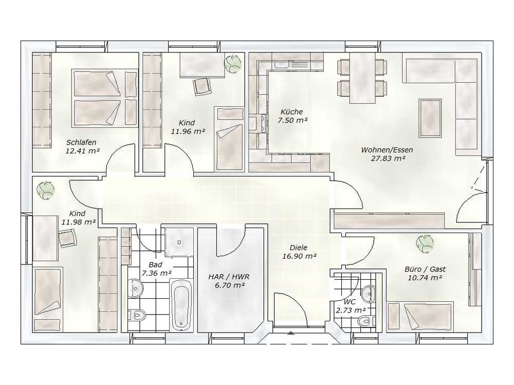 Dieser Bungalow ist das Parade-Beispiel für effiziente Raum-Ausnutzung: Auf 116 qm Wohnfläche findet die Bau-Familie nicht nur einen großzügigen Wohn-Ess-Bereich mit offener Küche über 35 qm sondern auch noch zwei Kinderzimmer, ein Arbeitszimmer, Schlafzimmer, Bad, Küche und Hauswirtschaftsraum!