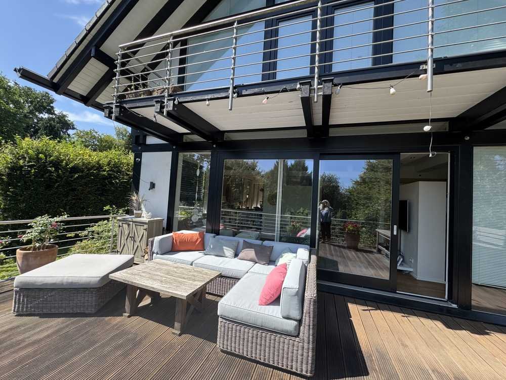 Wunderschönes Einfamilienhaus, es sind diese einmaligen Gelegenheiten…ein Traumhaus (Holzständerwerk) wie ein Huf Haus (dieses Haus ist von einem Mitbewerber), in gewachsener Umgebung mit diesem Traumgrundstück zu erwerben. Es besticht durch seine Leichtigkeit und Helligkeit, mit großen Fenstern und einer lichtdurchfluteten Galerie. Schon beim Auffahren auf die Naturkiesstraße kommt ein Gefühl von Urlaub im Süden, sowie Entspanntheit auf. Nachdem man das Haus betritt, befindet man sich in einer harmonisch abgestimmten Welt, das beginnt schon mit den handgebrannten Cotto Bodenfliesen, die durch ihre geölte Oberfläche Wärme ausstrahlen und harmonisch in die Eichenechtholzbohlen des Wohnzimmers übergehen…hier passt alles zusammen. Die recht neue Einbauküche (2019, kann ggf. übernommen werden) vom Schreiner auf Maß angepasst und die keinen Küchen- und Kochwunsch offenlässt; zu dem beidseitig nutzbaren Kamin, mit Sichtbereich von Wohnzimmer und Esszimmer; den bodentiefen Holzfenster; der superschönen gemütlichen Außenterrasse mit Holzdielen. Durch das helle Galerie Treppenhaus (mit schönem Edelstahl Geländer) erreicht man die obere Etage, in der sich das harmonisch gestaltete Haus wie folgt fortsetzt: 2 Kinderzimmer mit direktem Ausgang auf den schönen Balkon. Ein großzügiges Badewannen Bad, ein Schlafzimmer, ein großes Ankleidezimmer sowie einem großen Duschbadezimmer, der obere Bereich ist überwiegend mit Echtholz Parkett ausgelegt. Im Kellergeschoss (das Haus ist ca. 3/4 unterkellert, befinden sich die Hausanschlüsse, sowie die Abstellräume und zusätzlich ein Büro / Gästezimmer mit bodentiefen Fenstern und einer kleinen Terrasse. Das Objekt wird spätestens zum 30.06.2026 frei und befindet sich in einem sehr gepflegten Zustand.