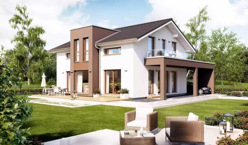 Darf es etwas mehr sein? Wer ein großzügiges Platzangebot für bis zu fünf Personen sucht, wird bei diesem Fertighaus fündig. Von außen überzeugt das moderne Familiendomizil mit seiner anspruchsvollen Architektur. Auf der Traufseite schiebt sich ein großzügig verglastes Querhaus in den Baukörper, dessen puristisches Flachdach einen spannenden Kontrast zum klassischen Satteldach bildet. Auf der Giebelseite wird das Haus von einem Balkon erweitert, der sich in seinem weiteren Verlauf in einen praktischen Carport verlängert. Beide Architektur-Bauteile setzen sich mit einem dunklen Grauton von der strahlend weißen Putzfassade ab. Schöne Details sind die partielle Holzverschalung am Querhaus und die Holzfensterrahmen, die dem modernen Gebäude Gemütlichkeit verleihen. Der Eingang liegt auf der Giebelseite. Nach dem Betreten des Hauses finden sich die Bewohner und Besucher in einer geräumigen Diele wieder, die auch den Treppenaufgang beherbergt. Damit kein Platz verschwendet wird, wurde unter der geradläufigen Treppe ein kompakter Abstellraum eingeplant. Jacken, Taschen und Schuhe können in der Garderobe gleich links neben dem Eingang abgelegt werden. So stören keine Kleiderhaken und Schuhregale das luftige Ambiente. Von der Garderobe aus kann man das Gäste-WC und den Technikraum betreten. Rechts der Diele liegen ein helles Homeoffice sowie die Küche, die sich je nach Bedarf einrichten lässt. Der lichtdurchflutete Platz im Querhaus bietet sich an für eine kleine Sitzecke. Oder man legt sich hier seinen eigenen kleinen Dschungel mit verschiedenen Zimmerpflanzen an. Fließend geht die Küche in den Wohn- und Essbereich, der sich über die gesamte Hausbreite erstreckt, über. Mit mehr als 32 m² Wohnfläche bietet er viel Freiraum für die gemeinsamen Aktivitäten der Familie. Ruhe und Entspannung finden die Bewohner im Dachgeschoss, wo sich die Privaträume befinden. Drei Kinderzimmer, ein separates Kinderbad mit Dusche und ein Schlafraum mit Ankleide und eigenem Wellnessbad laden hier zum Träumen und Wohlfühlen ein.