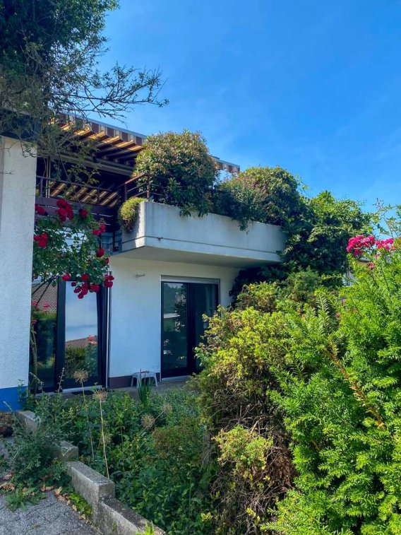 Eine weitere Ebene führt in das helle Wohnzimmer mit Zugang zum Ost-Balkon. Von dort aus gelangt man auf die oberste Ebene, die einen offenen Essbereich mit Blick ins Wohnzimmer, eine Küche mit kleiner verglaster Loggia sowie ein zusätzliches Zimmer umfasst. Die offene Gestaltung der Wohnetagen und die Split-Level-Bauweise verleihen dem Haus ein großzügiges Raumgefühl, das durch die hohen Decken im Wohn- und Essbereich zusätzlich unterstrichen wird.