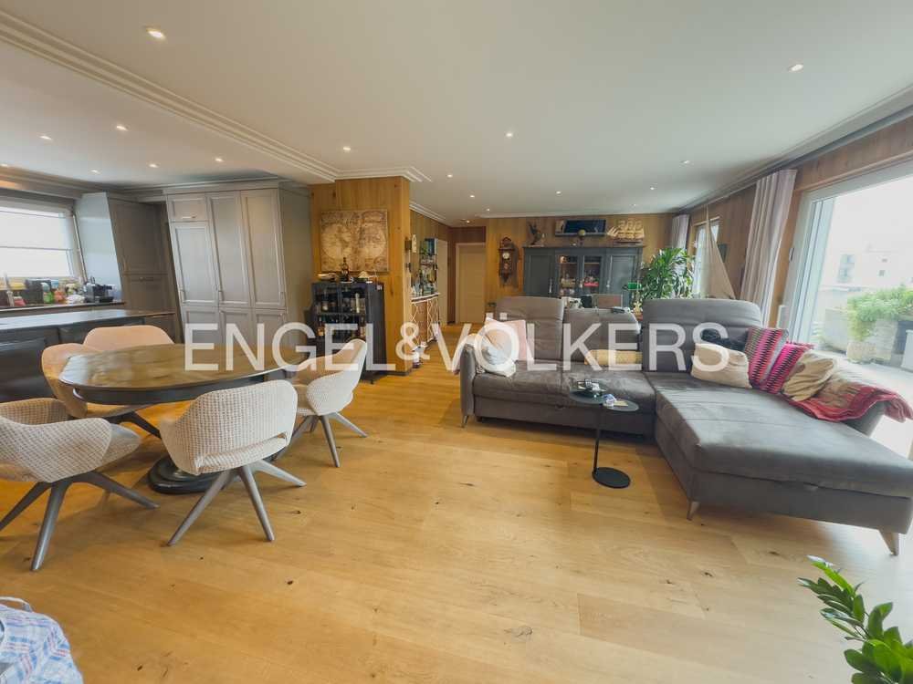 Der fließende Übergang von Wohn-, Ess- und Kochbereich verleiht dem Raum eine elegante Weite. Bodentiefe Fensterfronten öffnen den Blick in die Umgebung und verbinden das Innenleben der Wohnung mit der großzügigen Sonnenterrasse. Edles Echtholzparkett und fein abgestimmte Steinfliesen prägen die harmonische Materialästhetik.