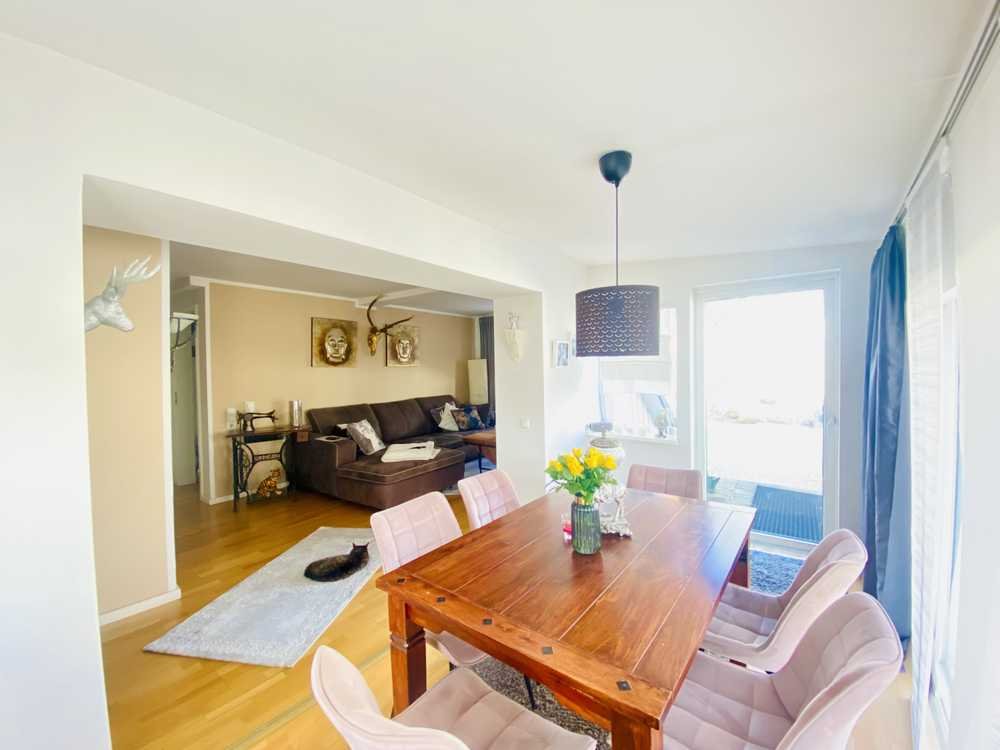 Das gemütliche und lichtdurchflutete Wohnzimmer ist durch eine Stufe leicht vom Essbereich abgetrennt. Von hier hat man Zugang zur Terrasse.