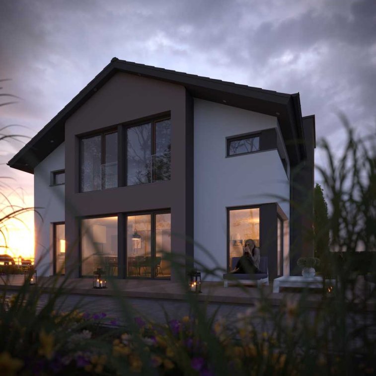 Das Haus ist auf einem realen Baugrundstück geplant oder auf einem Grundstück in einer Planungsphase. Die Bilder zeigen ggf. Extras, die im Rahmen des Bebauungsplans noch geprüft werden müssen.
